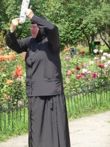 Ensuite, nous rencontrons la deuxième personne intéressante de la journée en la personne de Mère Tatiana au Monastère Modovita, édifice avec des tuiles (lauzes) en bois. Parlant couramment le français (et l’allemand !) la Mère avait déjà commencé la description des peintures ornant les murs extérieurs et intérieurs du Monastère. A la fin de son intervention, malgré la chaleur et l’heure tardive du déjeuner, elle a repris sa description du siège de Constantinople sur le mur extérieur Sud. Elle a tenu à préciser à l’attention toute spéciale de NH sa liste très exhaustive des ennemis de la Roumanie : Hongrois, Russes, Turcs, Arabes et Juifs. « C’est l’histoire » ajouta-t-elle, « il faut s’en souvenir » !